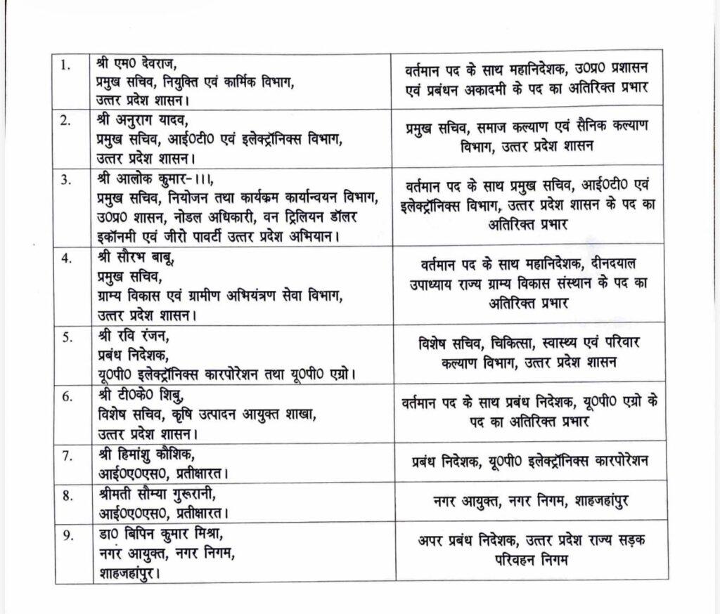 प्रतीक्षारत हिमांशु कौशिक को प्रबंधन निदेशक यूपी इलेक्ट्रॉनिक्स कॉर्पोरेशन व प्रतीक्षारत सौम्या गुरुरानी को नगर आयुक्त शाहजहांपुर के पद की जिम्मेदारी दी गई है। शाहजहांपुर के नगर आयुक्त डॉ. बिपिन कुमार मिश्रा को अपर प्रबंध निदेशक, उप्र राज्य सड़क परिवहन निगम बनाया गया है।