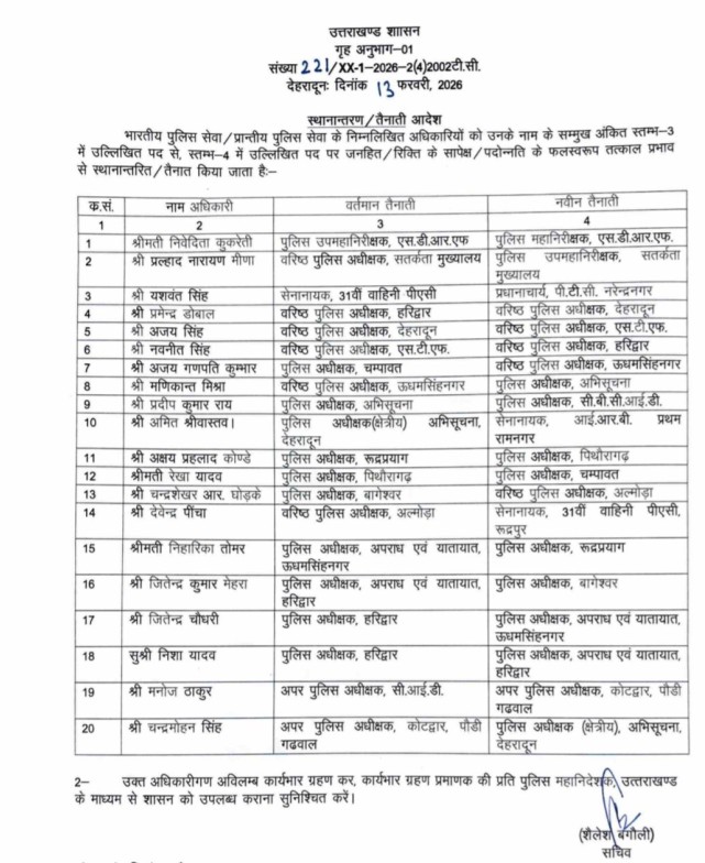 इस प्रशासनिक फेरबदल के अंतर्गत जितेंद्र मेहरा को बागेश्वर जिले की कमान सौंपी गई है। इसके अलावा कई अन्य वरिष्ठ अधिकारियों को भी नई जिम्मेदारियां दी गई हैं, जिससे पुलिस विभाग में कार्यप्रणाली को और अधिक प्रभावी बनाया जा सके।