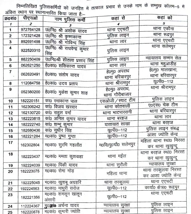 Deoria: जिले की कानून-व्यवस्था को और सुदृढ़ करने के उद्देश्य से पुलिस विभाग में एक बार फिर बड़े पैमाने पर फेरबदल किया गया है। पुलिस अधीक्षक संजीव सुमन ने सोमवार की रात 25 पुलिसकर्मियों के कार्यक्षेत्र बदलने के आदेश जारी कर दिए। यह तबादला सूची पुलिस विभाग की आंतरिक व्यवस्था को मजबूती देने और पुलिसिंग को अधिक सक्रिय बनाने के उद्देश्य से तैयार की गई है।
