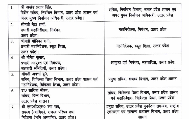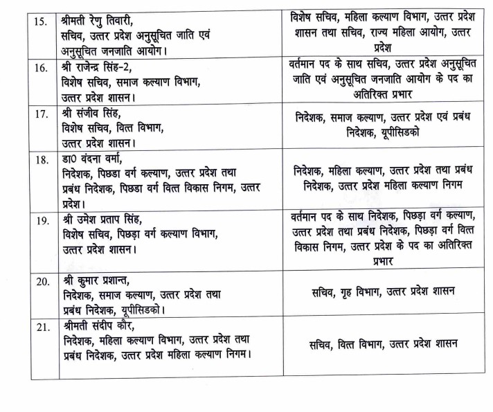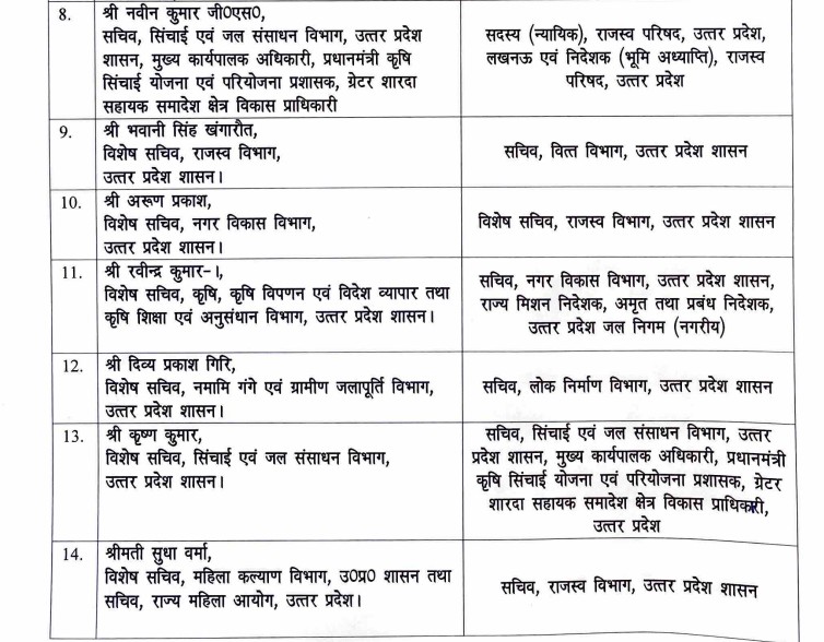 कुमार प्रशांत अब सचिव, बेसिक शिक्षा परिषद के रूप में कार्य करेंगे। अर्चना वर्मा को राजस्व विभाग का प्रमुख सचिव बनाया गया है। डॉ. सतीश चंद्र को वित्त विभाग से हटाकर चिकित्सा शिक्षा विभाग का सचिव और महानिदेशक (DGME) की जिम्मेदारी दी गई है। वहीं भवानी सिंह खंगारौत अब उत्तर प्रदेश के नए वित्त सचिव होंगे।