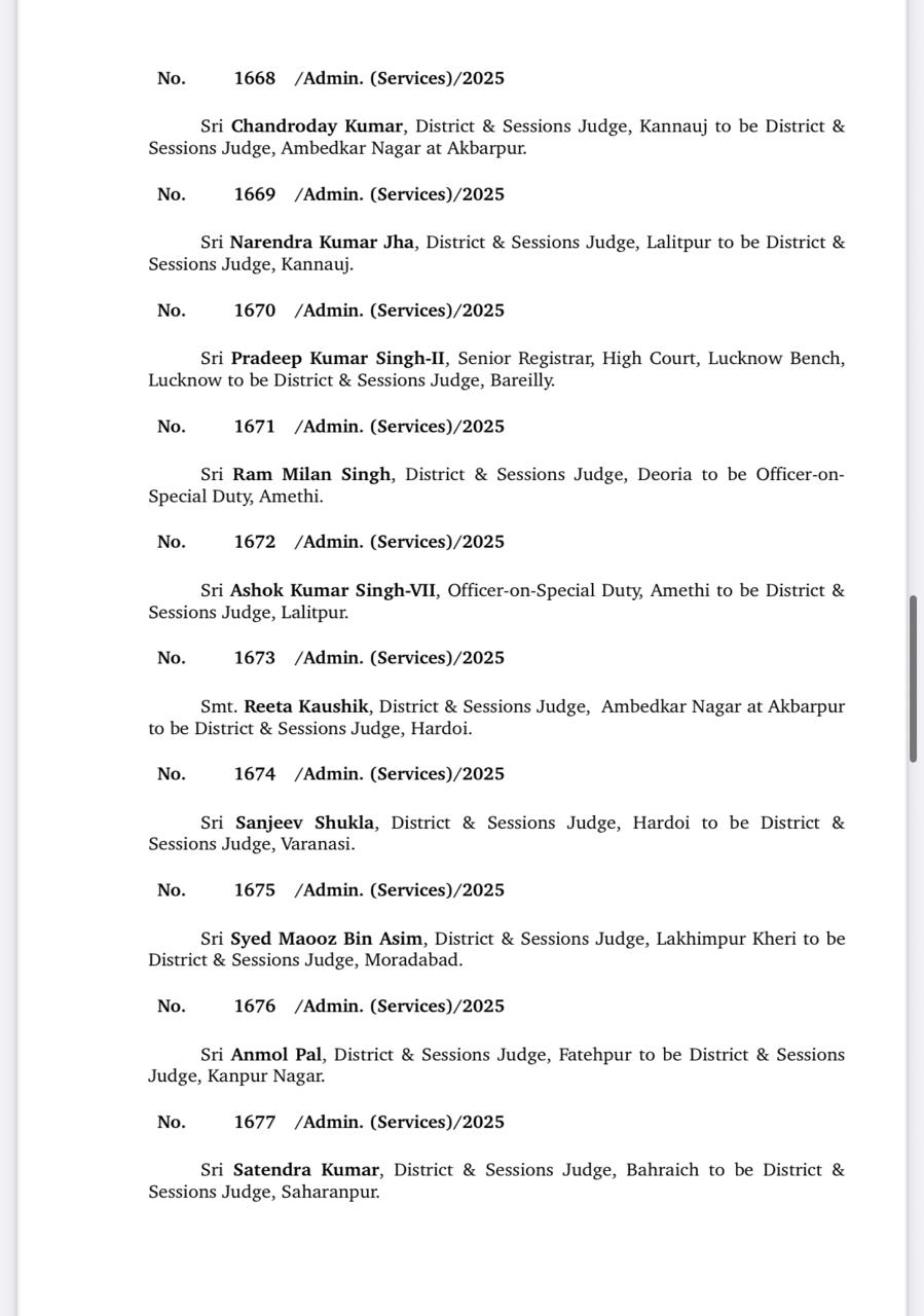 Lucknow: उत्तर प्रदेश सरकार ने न्यायिक व्यवस्था को सुदृढ़ बनाने के लिए बड़े पैमाने पर जिला जजों के तबादले किए हैं। महराजगंज, देवरिया, कन्नौज, बरेली, अमेठी, हरदोई, बुलंदशहर समेत कई जिलों में जिला जजों की नई तैनाती हुई है।