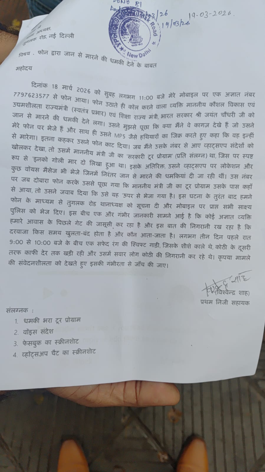 उनके पर्सनल असिस्टेंट, विश्वेंद्र शाह को फोन के जरिए धमकी दी गई। धमकी देने वाले की पहचान पश्चिम बंगाल के मुर्शिदाबाद के इस्माइल के तौर पर हुई है। आरोप है कि उसके पास मंत्री के आधिकारिक दौरे के प्लान की एक कॉपी थी। दिल्ली पुलिस ने शिकायत दर्ज कर ली है और पश्चिम बंगाल पुलिस भी इस पूरे मामले की जांच कर रही है।