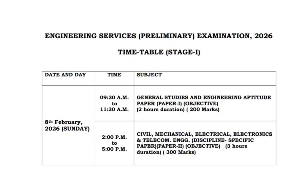 इंजीनियरिंग प्रारंभिक परीक्षा 8 फरवरी 2026 को दो शिफ्ट में आयोजित की जाएगी। पहली शिफ्ट सुबह 9:30 बजे से 11:30 बजे तक होगी, जबकि दूसरी शिफ्ट दोपहर 2 बजे से शाम 5 बजे तक आयोजित की जाएगी। उम्मीदवारों को सलाह दी जाती है कि वे समय से पहले परीक्षा केंद्र पर पहुंचें और सभी आवश्यक दस्तावेज साथ लाएं।
