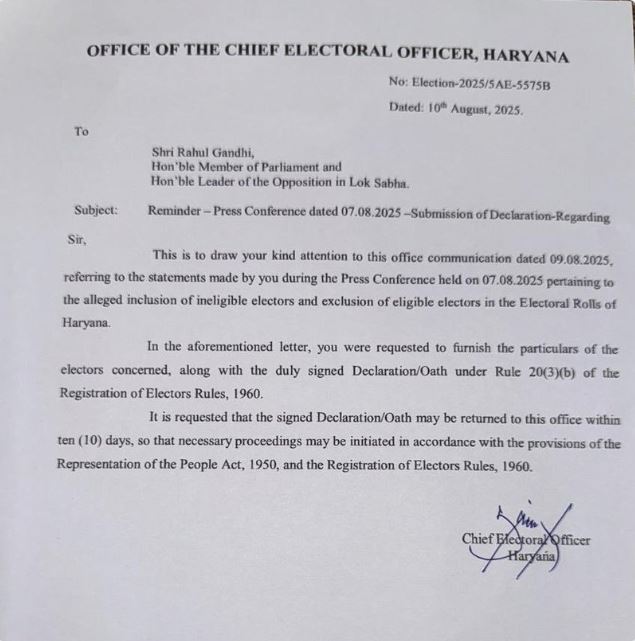 हरियाणा के मुख्य निर्वाचन अधिकारी की ओर से जारी पत्र के अनुसार प्रेसवार्ता के दौरान राहुल गांधी ने दिए गए बयानों में उल्लेख है कि हरियाणा की मतदाता सूची में कथित रूप से अयोग्य मतदाताओं को शामिल करने और योग्य मतदाताओं को बाहर करने से संबंधित है।