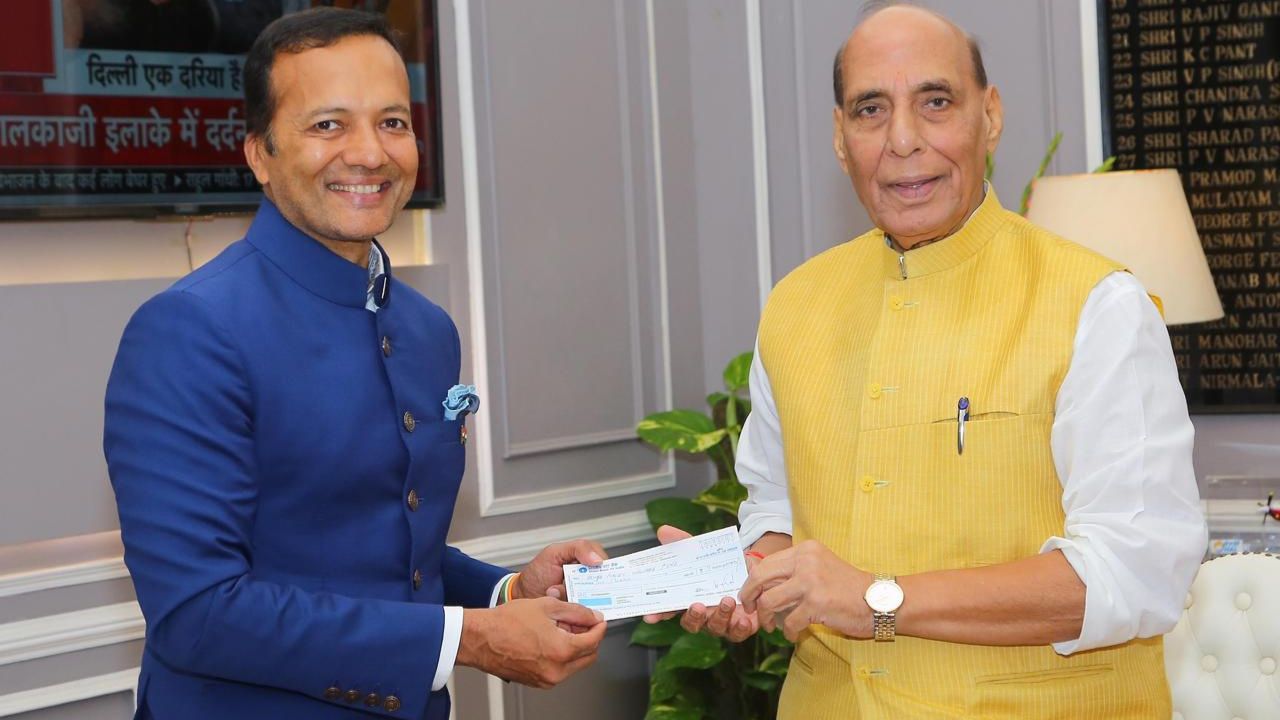 जिन्दल स्टील के चेयरमैन नवीन जिन्दल ने रक्षा मंत्री राजनाथ सिंह को सौंपा चेक