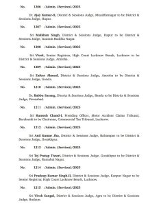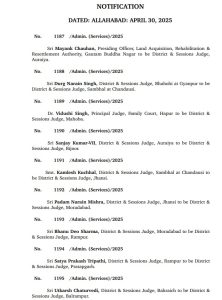 औरैया, संभल, महोबा, बिजनौर, झांसी, मुरादाबाद के अलावा रामपुर, प्रतापगढ़, बाराबंकी, बलरामपुर, इटावा, बहराइच, वाराणसी, मेरठ, महराजगंज, बांदा, पीलीभीत, आगरा, बागपत, हापुड़, नोएडा, अमरोहा, गोंडा, फिरोजाबाद, गोरखपुर, रमाबाई नगर, बदायूं, कानपुर नगर, प्रयागराज, मुज्जफरनगर, गाजियाबाद, भदोही, फर्रुखाबाद, अलीगढ़, कौशांबी, मथुरा, देवरिया, हाथरस, श्रावस्ती, कैराना के जिला जज भी बदले गये हैं।