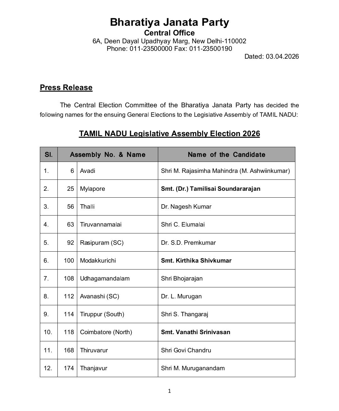 Chennai: तमिलनाडु विधानसभा चुनाव 2026 को लेकर राजनीतिक सरगर्मियां तेज हो गई हैं। इस बीच भारतीय जनता पार्टी (बीजेपी) ने एनडीए गठबंधन के तहत अपनी 27 उम्मीदवारों की पहली सूची जारी कर दी है। पार्टी ने सहयोगी AIADMK के साथ सीट साझा समझौते के बाद यह सूची घोषित की है।