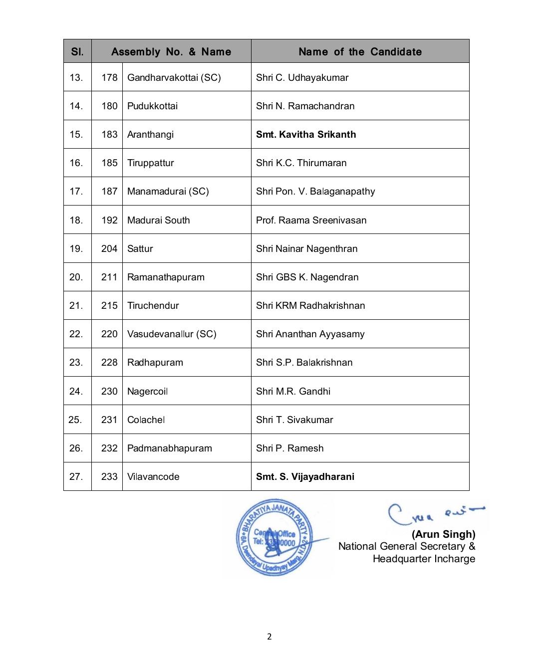 बीजेपी ने केंद्रीय मंत्री L. Murugan को अविनाशी (SC) सीट से उम्मीदवार बनाया है। वह पार्टी के प्रमुख दलित चेहरों में से एक माने जाते हैं और पहले तमिलनाडु बीजेपी के प्रदेश अध्यक्ष भी रह चुके हैं। उनकी उम्मीदवारी से पार्टी ने पश्चिमी तमिलनाडु और दलित वोट बैंक को साधने का संकेत दिया है।