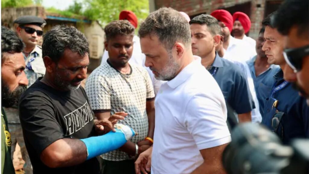 Chandigarh: पंजाब के गुरदासपुर जिले में सोमवार को एक राजनीतिक और मानवीय दृश्य एक साथ देखने को मिला जब कांग्रेस सांसद और पूर्व अध्यक्ष राहुल गांधी बाढ़ प्रभावित इलाकों का जायजा लेने पहुंचे। यह दौरा केवल आपदा राहत के संदर्भ में नहीं रहा, बल्कि सुरक्षा को लेकर एक बड़ा राजनीतिक संदेश और विवाद भी छोड़ गया। राहुल गांधी दीनानगर के मकोड़ा पतन इलाके में पहुंचे थे, जहां रावी नदी के कारण कई गांव जलमग्न हो गए हैं। इन गांवों में से कई पाकिस्तान सीमा के बिल्कुल नजदीक स्थित हैं, और यही निकटता इस पूरे घटनाक्रम की जड़ बन गई।
