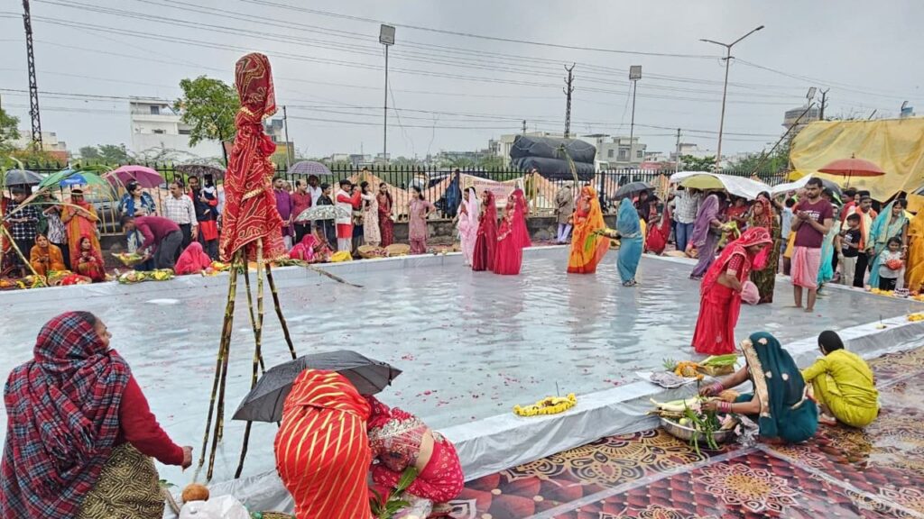 राजस्थान के भीलवाड़ा में छठ महापर्व हर्षोल्लास के साथ मनाया जा रहा है। इस दौरान घाटों पर श्रद्धा का सैलाब देखा गया। श्रद्धालुओं ने भारी बारिश के बीच डूबते सूर्य को अर्घ्य देकर छठ महापर्व मनाया।