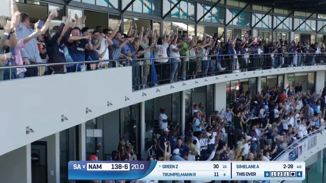 दबाव में, जेन ग्रीन ने 23 गेंदों पर नाबाद 30 रन बनाए, टीम को हार के कगार से बचाते हुए ऐतिहासिक जीत दिलाई। रुबेन ट्रम्पेलमैन भी उनके साथ मैदान पर रहे और 11 रन बनाकर नाबाद रहे। नामीबिया की जीत की सराहना करते हुए उत्साहित दर्शक