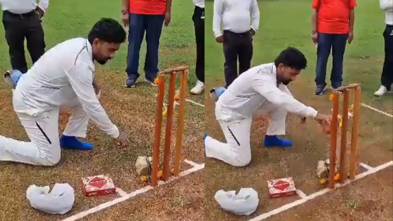 शम्स मुलानी का यह वीडियो सोशल मीडिया पर तेजी से वायरल हो रहा है, जिसमें शम्स को पूरी श्रद्धा के साथ पूजा करते देखा जा सकता है। इस तरह की परंपरा आम तौर पर पिच तैयार करने वाले ग्राउंड स्टाफ निभाते हैं, लेकिन एक पेशेवर खिलाड़ी द्वारा ऐसा करना लोगों के लिए प्रेरणादायक बन गया है।