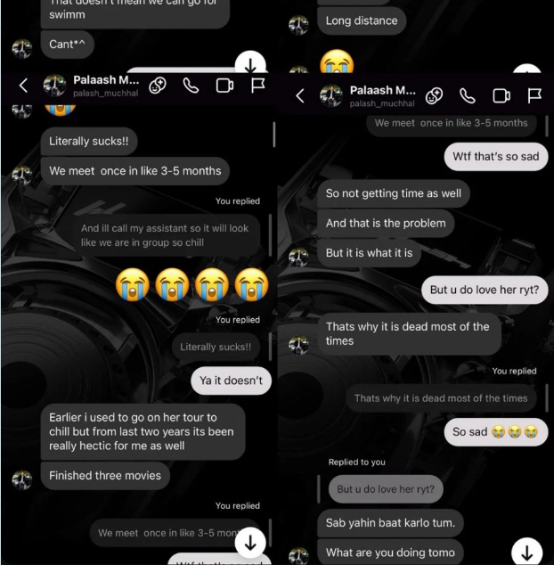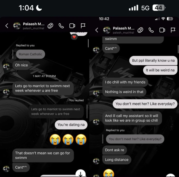 लेकिन शादी स्थगित होने की घोषणा के महज़ 24 घंटे के भीतर ही एक नया विवाद सामने आया, जिसने सोशल मीडिया को हिला दिया। रेडिट और इंस्टाग्राम पर पलाश मुच्छल की एक महिला के साथ कथित चैट्स वायरल होने लगीं, जिन्हें कई यूज़र्स फ्लर्टिंग चैट बता रहे हैं। इन स्क्रीनशॉट्स में पलाश उस महिला से ‘लॉन्ग डिस्टेंस रिलेशनशिप’, ‘टूर’, मुंबई के वर्सोवा बीच पर सुबह मिलने के प्रस्ताव और व्यक्तिगत प्रशंसा जैसी बातें करते दिख रहे हैं। हालांकि इन चैट्स की सत्यता पर अब तक कोई आधिकारिक पुष्टि नहीं हुई है।