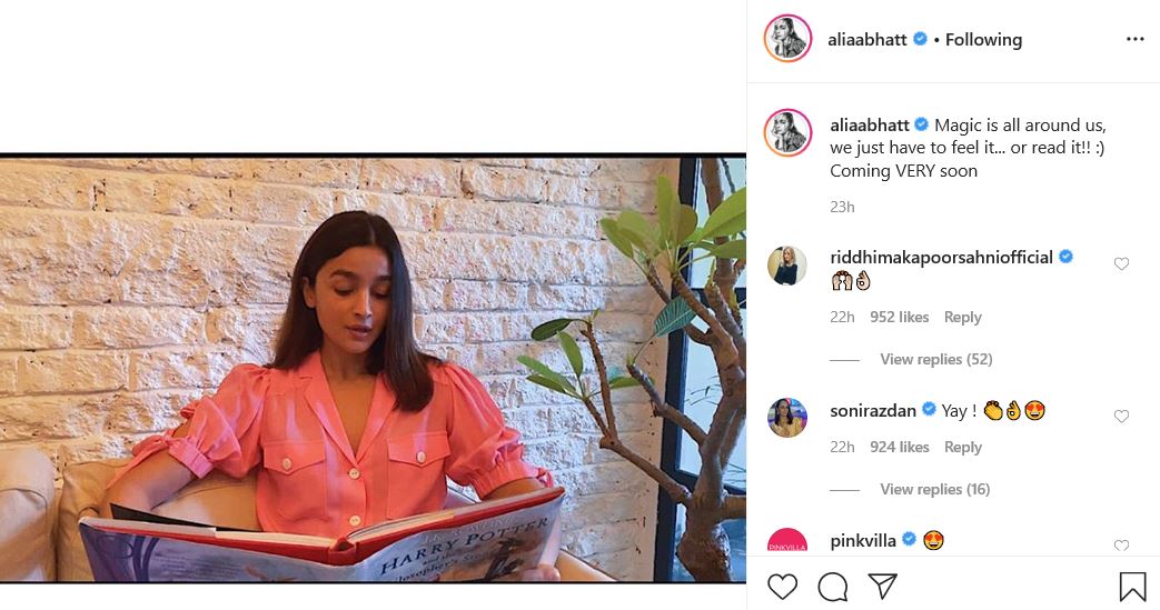 आलिया ने किताब के साथ अपनी तस्वीर पोस्ट की और इस तस्वीर के कैप्शन में लिखा, मैजिक हमारे आस-पास ही है। हमें उसे बस महसूस करना है। या पढ़ना है।
