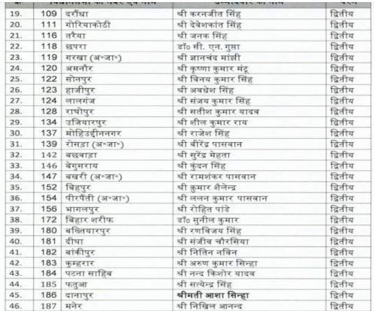 भाजपा ने अपनी इस सूची में केंद्रीय मंत्री अश्विनी कुमार चौबे के बेटे का भी नाम शामिल है। वहीं पटना शहर की सभी पांच विधानसभा में बीजेपी ने अपने विधायकों पर फिर से भरोसा जताया है।