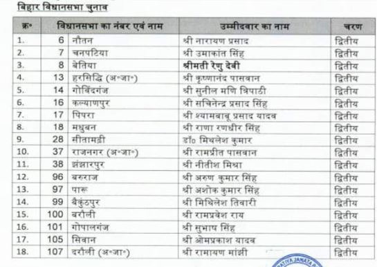 भाजपा की राष्ट्रीय चुनाव संचालन समिति की दिल्ली में हुई बैठक के बाद रविवार को दूसरे चरण के प्रत्याशियों की सूची जारी कर की गयी।