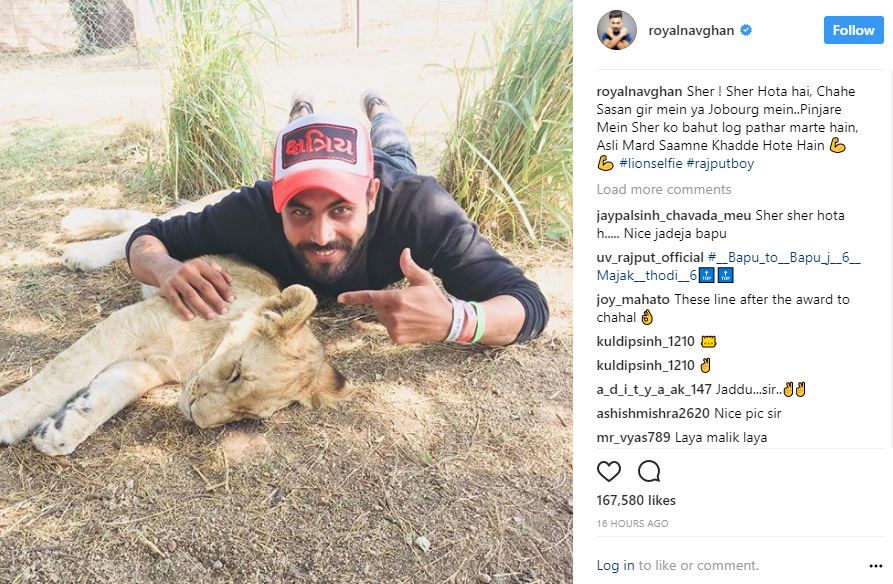 फोटो शेयर करते हुए जडेजा ने लिखा कि शेर तो शेर होता है, चाहे सासन गिर हो या फिर जोहानिसबर्ग। पिंजरे में शेर को बहुत लोग पत्थर मारते हैं, असली मर्द सामने खड़े होते है।