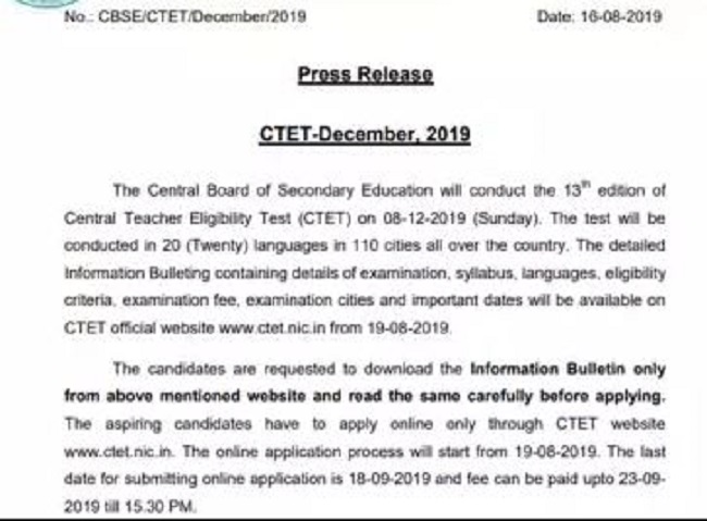 परीक्षा से संबंधित सभी महत्वपूर्ण जानकारियां जैसे भाषाएं, पाठ्यक्रम, योग्यता मानदंड, परीक्षा शुल्क, परीक्षा शहर और महत्वपूर्ण तिथियों की जानकारी CTET की आधिकारिक वेबसाइट ctet.nic.in पर दिनांक 18.08.2019 से उपलब्ध होगी।