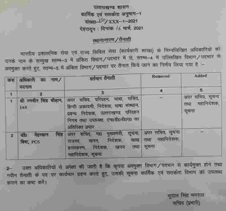 देहरादून: उत्तराखंड की नवनियुक्त तीरथ सिंह रावत सरकार ने मंगलावार को एक बड़ा फैसला लेते हुए मेहरबान सिंह बिष्ट को अपर सचिव सूचना तथा महानिदेशक सूचना के महत्वपूर्ण पद से हटा दिया है। मेहरबान सिंह बिष्ट के स्थान पर आईएएस रणवीर सिंह चौहान को महानिदेशक सूचना की जिम्मेदारी सौंपी गई है।