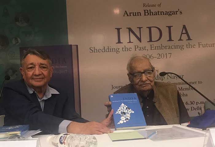 नई दिल्ली: इंडिया इंटरनेशनल सेंटर में आयोजित एक भव्य कार्यक्रम में प्रसार भारती के पूर्व चेयरमैन और सेवानिवृत्त मध्य प्रदेश कैडर के वरिष्ठ आईएएस अरूण भटनागर की किताब 'इंडिया शेड़िंग द पास्ट, एम्ब्रैसिंग द फ्यूचर 1906-2017' का विमोचन किया गया। समारोह में बतौर मुख्य अतिथि उपस्थित देश के वरिष्ठ पत्रकार कुलदीप नैयर ने इस किताब का विमोचन किया।