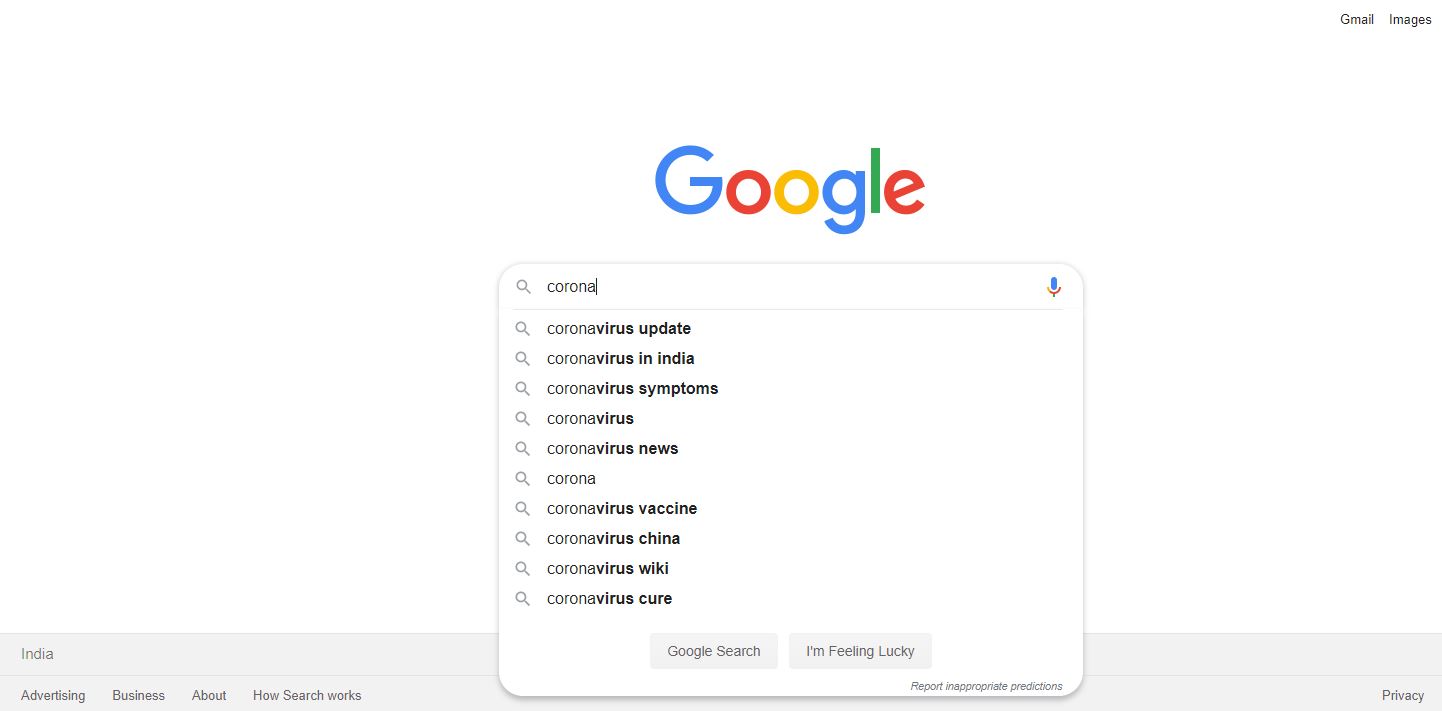 इस बीच लोग अपनी सुरक्षा के लिए कोरोना से जुड़ी कई चीजों को गूगल पर सर्च कर रहे हैं। जब हमने गूगल सर्च ट्रेंड में देखा तो, पता चला की लोग सबसे ज्यादा coronavirus update को सर्च कर रहे हैं, जिससे उन्हें दुनिया में कोरोना से जुड़ी हर जानकारी मिल सके। इसके बाद coronavirus in india को दूसरे नंबर पर सबसे ज्यादा सर्च किया जा रहा है। वहीं तीसरे नंबर पर coronavirus symptoms को सर्च किया जा रहा है। जिससे लोग अपने परिजनों और खुद में सही समय पर कोरोना वायरस के लक्षणों को पहचान सकें और सही समय पर बचाव कर सकें।