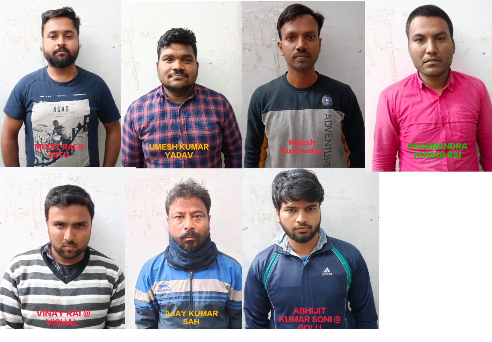 गिरफ्तार अभियुक्तों की पहचान मुदित राय उर्फ मीतू निवासी थाना गौरी बाजार, जनपद देवरिया, उमेश कुमार यादव निवासी ग्राम पण्डितपुर, पोस्ट पण्डितपुर, थाना जनता बाजार, जिला छपरा (सारण) बिहार, राजेश कुशवाहा निवासी ग्राम-भटवलिया वार्ड नं0-2, थाना कोतवाली, जनपद देवरिया, विनय राय उर्फ विशाल निवासी ग्राम चरियांव खास, पोस्ट खैराबनुवा, थाना गौरीबाजार, जनपद देवरिया,अजय शाह निवासी ग्राम जनता बाजार सब्जी मण्डी के पास, थाना जनता बाजार, जिला छपरा (सारण), बिहार, अभिजीत कुमार सोनी उर्फ गोलू निवासी ग्राम जनता बाजार, सब्जी मण्डी के पास, थाना जनता बाजार, छपरा (सारण), बिहार और धर्मेन्द्र कुमार निवासी ग्राम टेहटी सिल्हौरी, थाना मढौरा, जिला छपरा (सारण), बिहार के रूप में की गई।