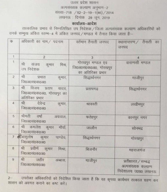 प्रदेश में तबादलों की सूचियां राज्य सरकार की ओर से लगातार जारी की जा रही हैं। आज तत्तकाल प्रभाव से अल्पसंख्यक कल्याण विभाग के उपनिदेशक और जिला अल्पसंख्यक कल्याण अधिकारियों का तबादला किया गया है।
