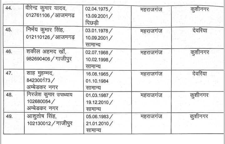 इंस्पेक्टर वीरेन्द्र यादव को कुशीनगर, शकील अहमद खां को कुशीनगर, शाह मुहम्मद को देवरिया और आशुतोष सिंह को कुशीनगर भेजा गया है।
