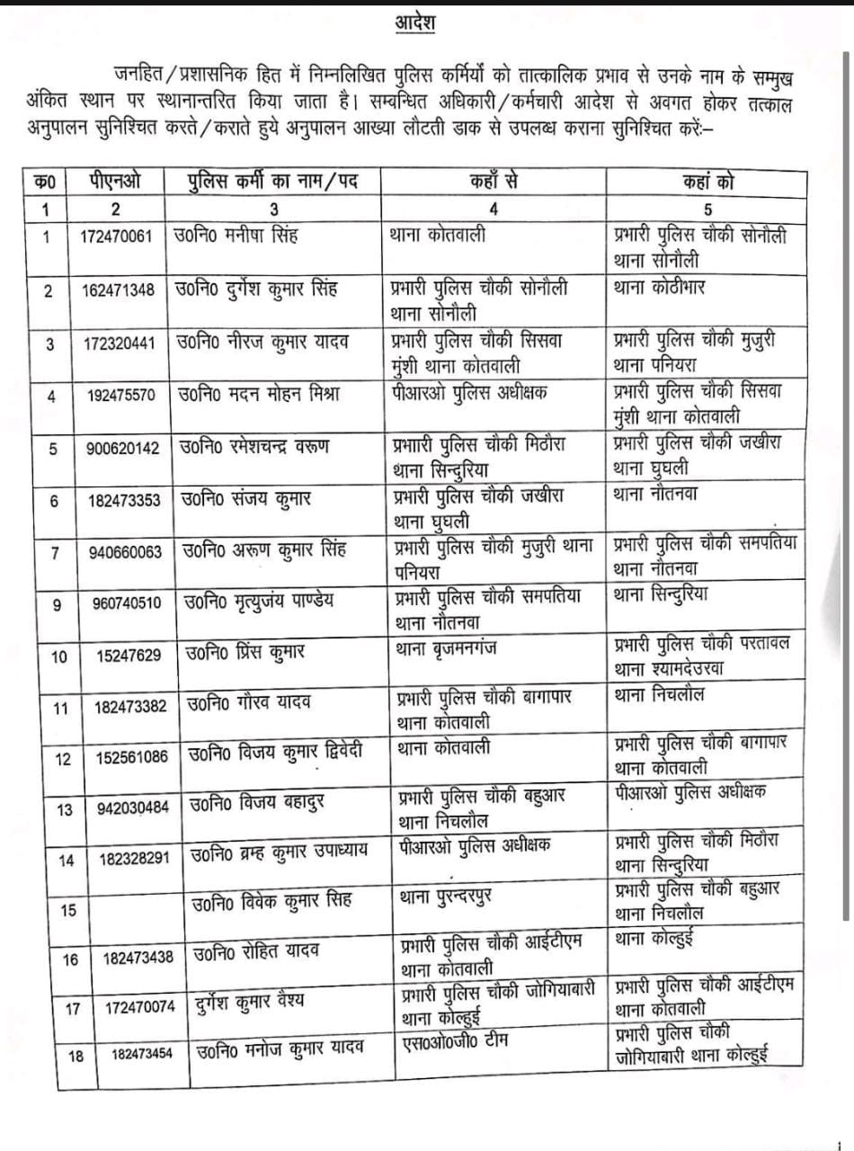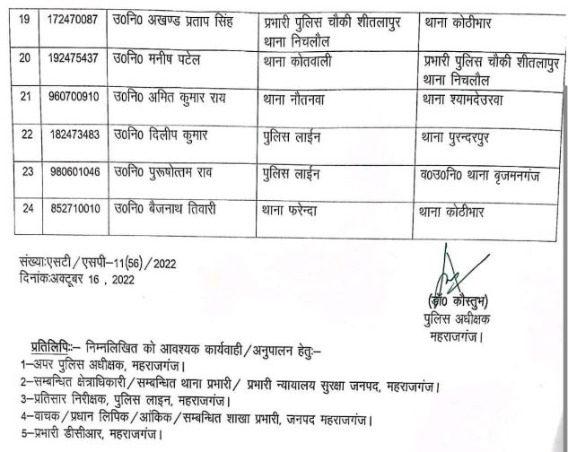 महराजगंज: जनपद में 24 दारोगाओं के तबादले किए गए है। जिले कोठीभार, नौतनवा, पनियरा, सोनौली, बृजमनगंज, कोल्हुई सहित तमाम चौकी इंचार्ज बदले गए है।