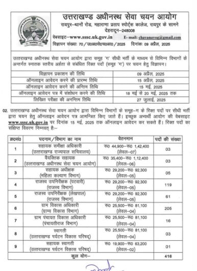 देहरादून: उत्तराखंड अधीनस्थ सेवा चयन आयोग (UKSSSC) ने कई विभागों में ग्रुप 'सी' के पदों को भरने के लिए भर्ती अभियान की घोषणा की है। इच्छुक उम्मीदवार आधिकारिक वेबसाइट (sssc.uk.gov.in.) के माध्यम से ऑनलाइन आवेदन कर सकते हैं।