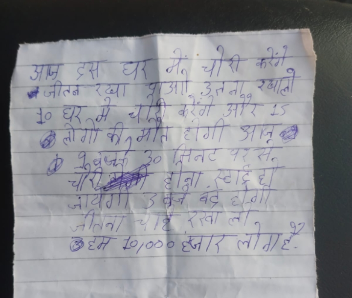 रायबरेली में चोर ने एक घर के सामने कागज पर लिखकर एलान किया कि वह 10 घरों में चोरी करेगा। पत्र में एक साथ 10 घरों में चोरी करने की बात लिखी है, बल्कि इसका विरोध करने पर 15 लोगों की हत्या करने की भी खौफनाक धमकी दी गई है।