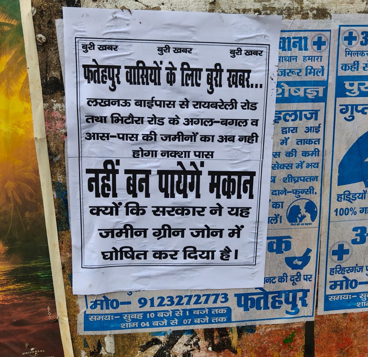 Fatehpur: फतेहपुर के सदर कोतवाली क्षेत्र स्थित रामा श्यामा मैरिज हाल के सामने कचहरी परिसर की दीवार पर चिपकाए गए एक पोस्टर ने पूरे इलाके में सनसनी फैला दी। पोस्टर में दावा किया गया कि लखनऊ बाईपास से लेकर रायबरेली रोड और भिटौरा रोड तक के आसपास की सभी जमीनों को सरकार द्वारा ग्रीन जोन घोषित कर दिया गया है। इसका सीधा मतलब यह है कि इन जमीनों पर अब कोई भी निर्माण कार्य, जैसे मकान बनाना, संभव नहीं होगा।