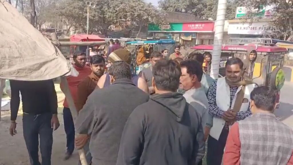 देवरिया में प्रशासन की कार्रवाई का विरोध करते स्थानीय