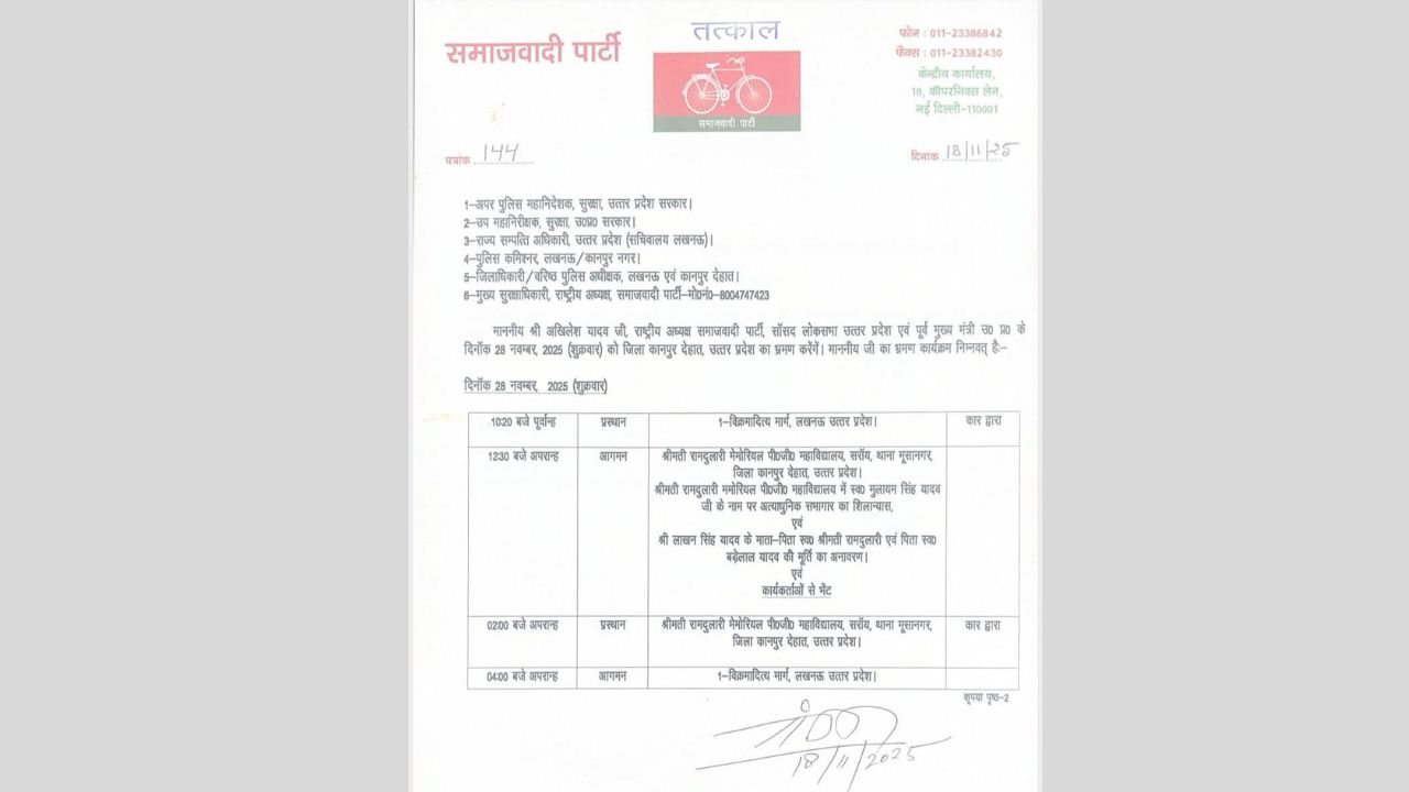 Kanpur Dehat: समाजवादी पार्टी के राष्ट्रीय अध्यक्ष और पूर्व मुख्यमंत्री अखिलेश यादव 28 नवंबर 2025 को कानपुर देहात जिले के एक दिवसीय दौरे पर रहेंगे। पार्टी की ओर से जारी अधिकृत पत्र के अनुसार उनका कार्यक्रम सुबह 10:20 बजे लखनऊ से कार द्वारा रवाना होने के बाद शुरू होगा। अखिलेश यादव का यह दौरा जिले में आयोजित कई महत्वपूर्ण कार्यक्रमों के कारण बेहद खास माना जा रहा है।