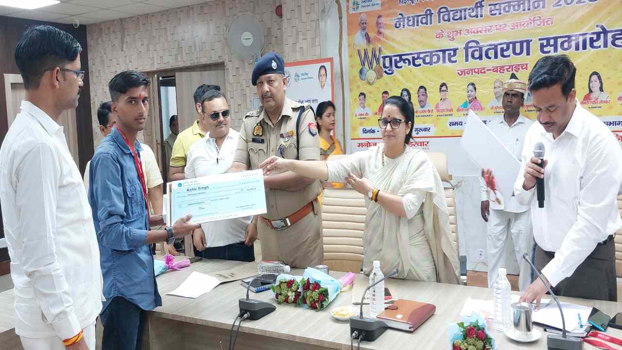 बहराइच : प्रदेश के मुंख्यमंत्री योगी आदित्यनाथ द्वारा इंदिरा गांधी प्रतिष्ठान लखनऊ में आयोजित समारोह में केन्द्र व राज्य स्तरीय बोर्ड की परीक्षाओं में उच्च अंक प्राप्त करने वाले मेधावी विद्यार्थियों को सम्मानित किया गया। विकास भवन सभागार में आयोजित अलंकरण समारोह में लखनऊ में आयोजित कार्यक्रम के सजीव प्रसारण के उपरान्त माध्यमिक शिक्षा परिषद प्रयागराज द्वारा आयोजित परिषदीय परीक्षा 2025 में उत्तीर्ण जनपद के मेधावी छात्र-छात्राओं को सम्मानित किया गया।