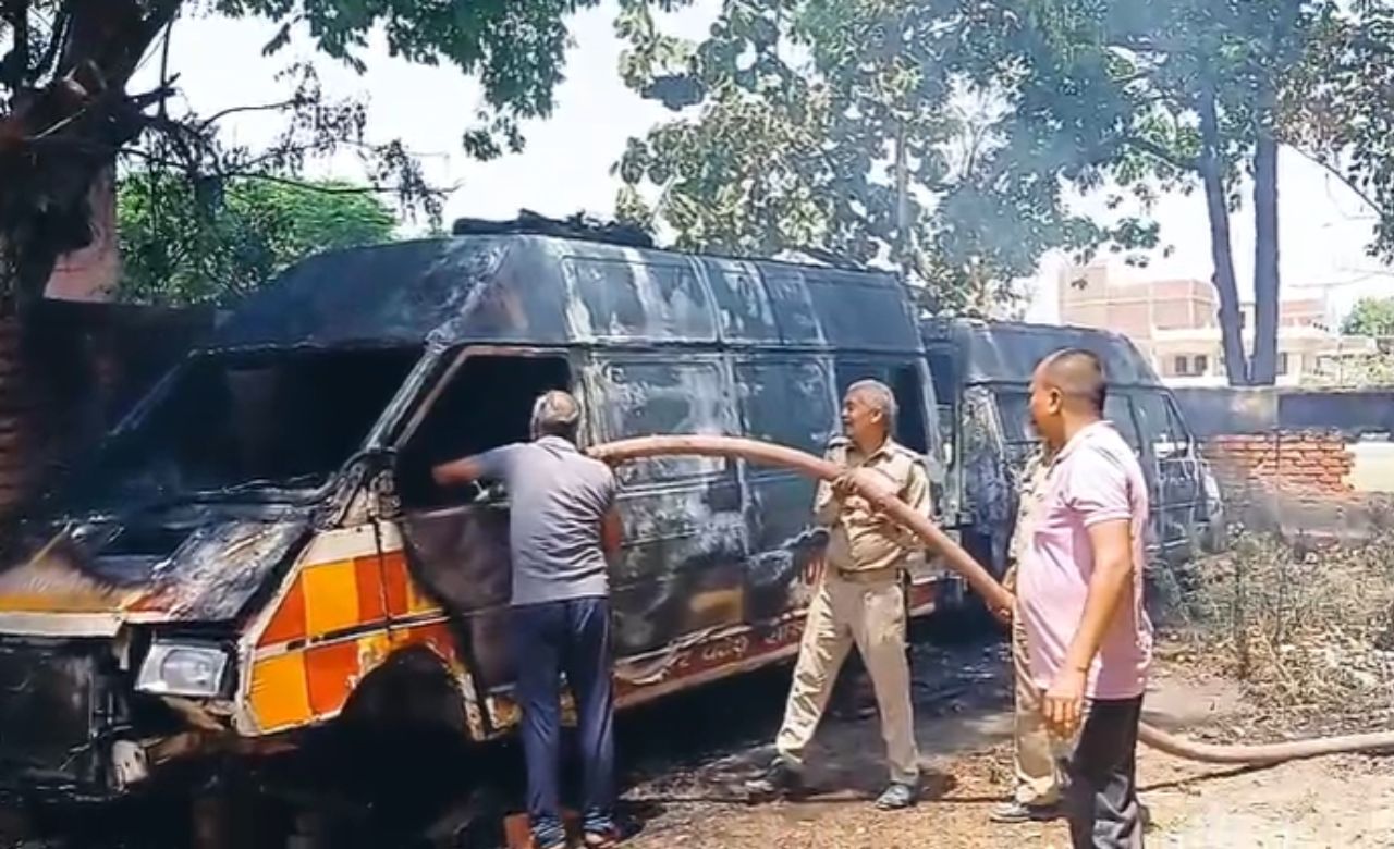 कबाड़ में खड़ी दो एंबुलेंस जलकर राख