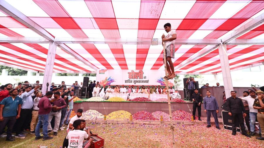 सैफई में आयोजित कार्यक्रम में मंच पर सपा के सभी नेताओं ने एक-दूसरे को गुलाब और अन्य सुगंधित फूल लगाकर होली की शुभकामनाएं दीं। ढोल-नगाड़ों और पारंपरिक लोकगीतों के बीच सपा कार्यकर्ता उत्साह में झूमते नजर आए।
