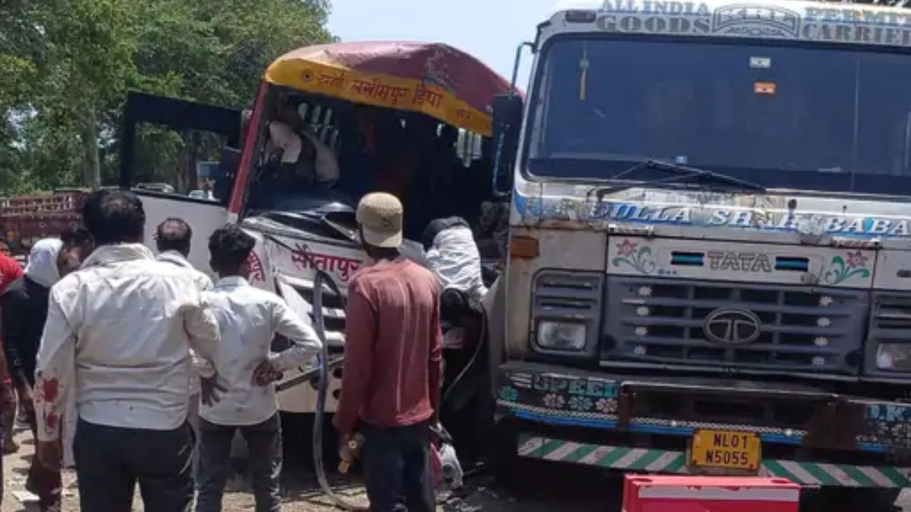 बस का अगला हिस्सा बुरी तरह क्षतिग्रस्त