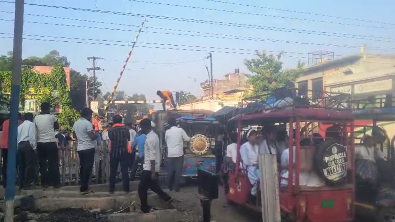 बिजनौर जिले के नगीना रेलवे फाटक पर रेत से भरी एक ओवरलोड ट्रैक्टर-ट्रॉली रेलवे ट्रैक पर फंस गई। इस कारण घंटों तक रेल सेवा बाधित रही और मेमो ट्रेन प्लेटफार्म तक नहीं पहुंच सकी। जाम की स्थिति बनी रही लेकिन रेलवे प्रशासन ने समय रहते कोई कार्रवाई नहीं की।