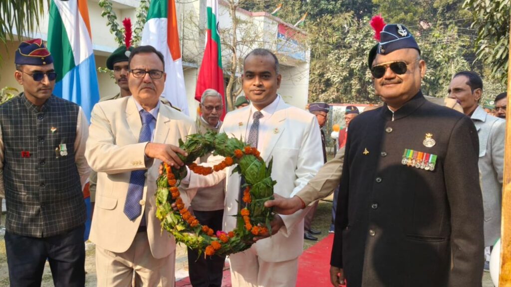 Kushinagar: जनपद के जिला सैनिक कल्याण कार्यालय परिसर में सोमवार को धूमधाम से गणतंत्र दिवस मनाया गया। इस अवसर पर ध्वजा रोहण किया गया और देशभक्ति का जोश देखा गया। कार्यक्रम के दौरान शहीद विधवा श्रीमती धर्मशीला देवी (पत्नी सिपाही संतोष यादव) को पुलिस अधीक्षक द्वारा शाल भेंट कर सम्मानित किया गया।