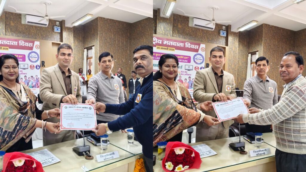 16वें राष्ट्रीय मतदाता दिवस पर उदयन सभागार में आयोजित कार्यक्रम में जिला निर्वाचन अधिकारी डॉ. अमित पाल ने उत्कृष्ट कार्य करने वाले बीएलओ, सुपरवाइजर और ऑपरेटरों को प्रशस्ति-पत्र देकर सम्मानित किया। दिव्यांग व 80 वर्ष से अधिक आयु के मतदाताओं को भी अंगवस्त्र भेंट किए गए।