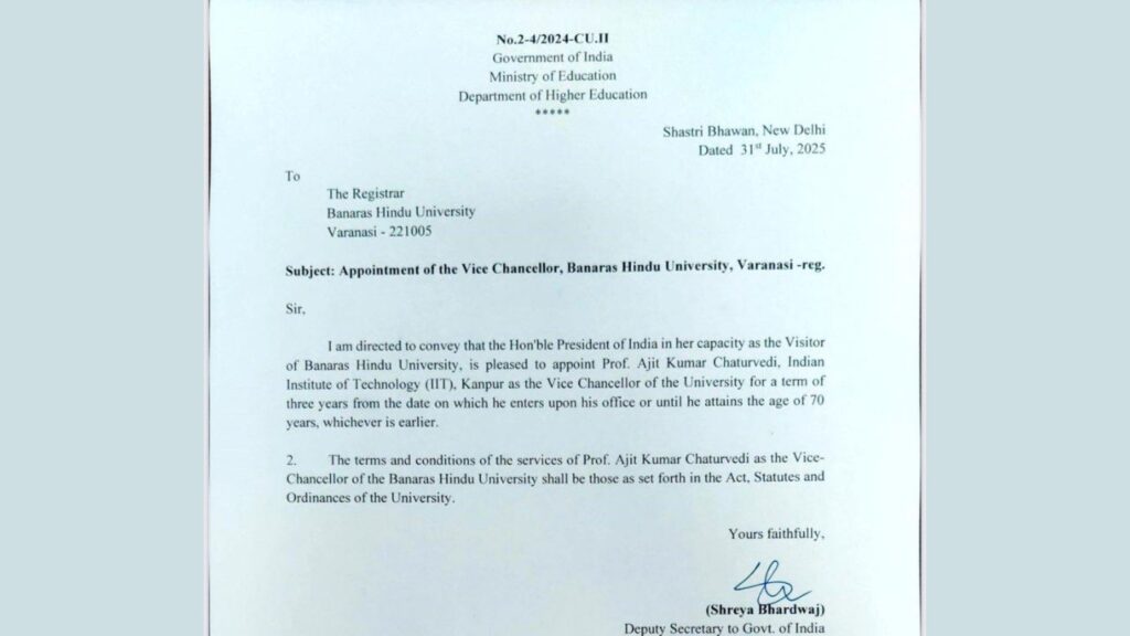 Lucknow: भारतीय प्रौद्योगिकी संस्थान (आईआईटी) कानपुर के प्रोफेसर अजीत कुमार चतुर्वेदी को बनारस हिंदू विश्वविद्यालय (बीएचयू) का नया कुलपति नियुक्त किया गया है। उनके योगदान को देखते हुए यह नियुक्ति की गई है और इस बाबत शिक्षा मंत्रालय की तरफ से आधिकारिक पत्र जारी किया गया है।