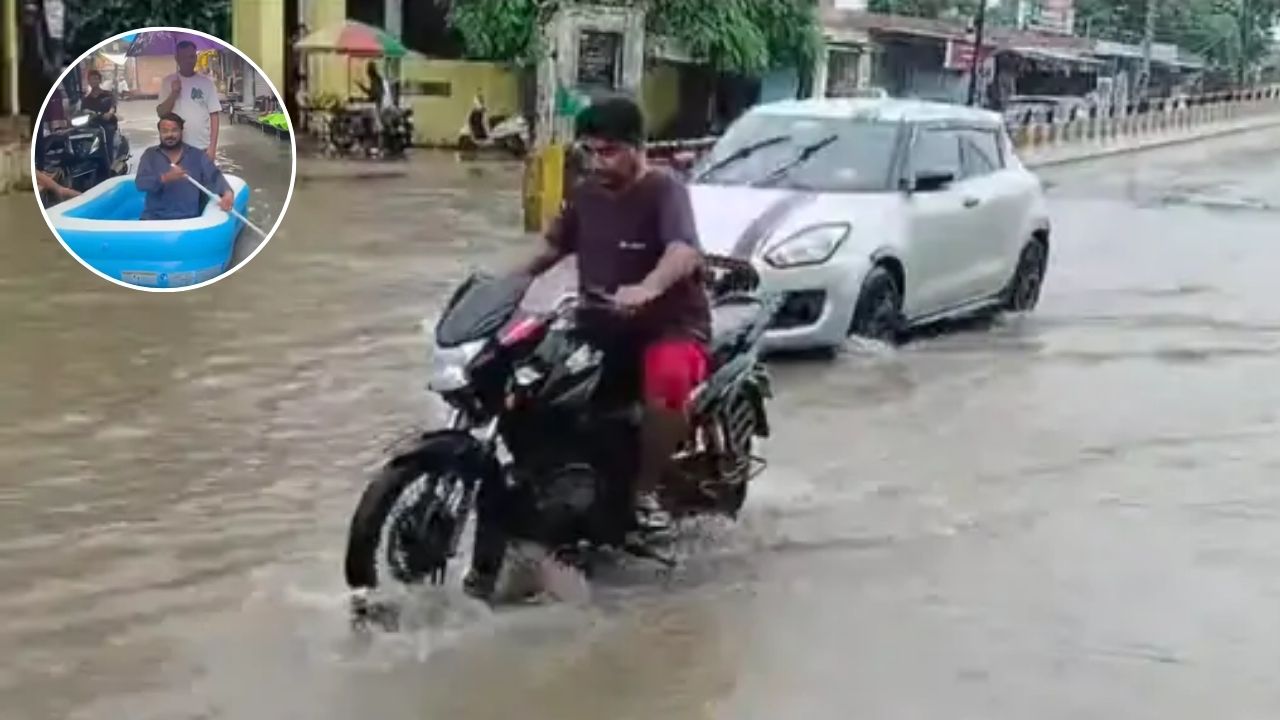 सड़क पर जमा पानी में एक छोटे से रबर बोट में बैठकर दुकानदार प्रतीकात्मक विरोध प्रदर्शन करते नजर आए। एक दुकानदार ने हाथ में वाइपर थाम रखी थी, मानों पानी में नाव चला रहे हों, जबकि दूसरे ने छतरी से बारिश से बचने का प्रयास किया। यह दृश्य नगर पंचायत की व्यवस्था पर बड़ा सवाल खड़ा करता है।