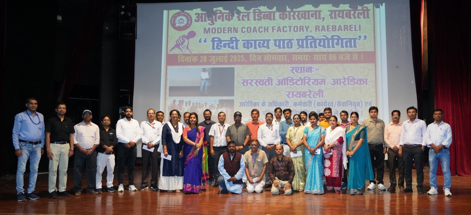आधुनिक रेल डिब्बा कारखाना, रायबरेली में राजभाषा विभाग द्वारा हिंदी काव्य पाठ प्रतियोगिता एवं पुरस्कार वितरण कार्यक्रम का आयोजन किया गया। इस प्रतियोगिता का मुख्य उद्देश्य काव्य में रचनात्मक कौशल एवं अपनी रचनाओं को बेहतर ढंग से प्रस्तुत करने की कला को विकसित करना है।