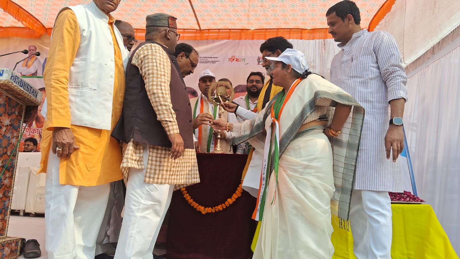 जनसभा को संबोधित करने से पहले दीप प्रज्वलित किया गया