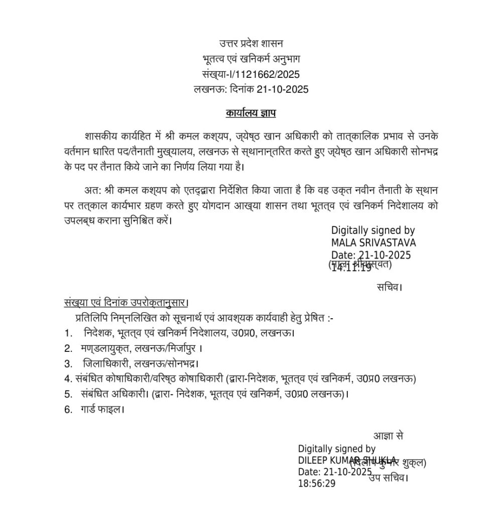 सोनभद्र के खनन अधिकारी का तबादला आदेश