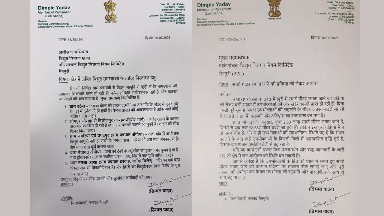 मैनपुरी सांसद डिंपल यादव ने बिजली विभाग को लिखे पत्र