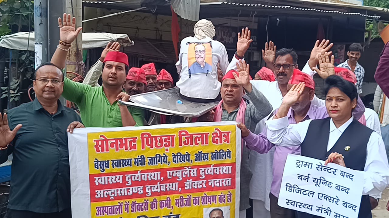 सोनभद्र के जिला अस्पताल में व्याप्त अव्यवस्थाओं के खिलाफ समाजवादी पार्टी ने सरकार पर निशाना साधा। कार्यकर्ताओं ने स्वास्थ्य मंत्री के प्रतीक पुतले को स्ट्रेचर पर बैठाकर विरोध जताया। सपा का आरोप है कि मेडिकल कॉलेज का दर्जा मिलने के बावजूद अस्पताल में बुनियादी सुविधाएं तक नहीं हैं।