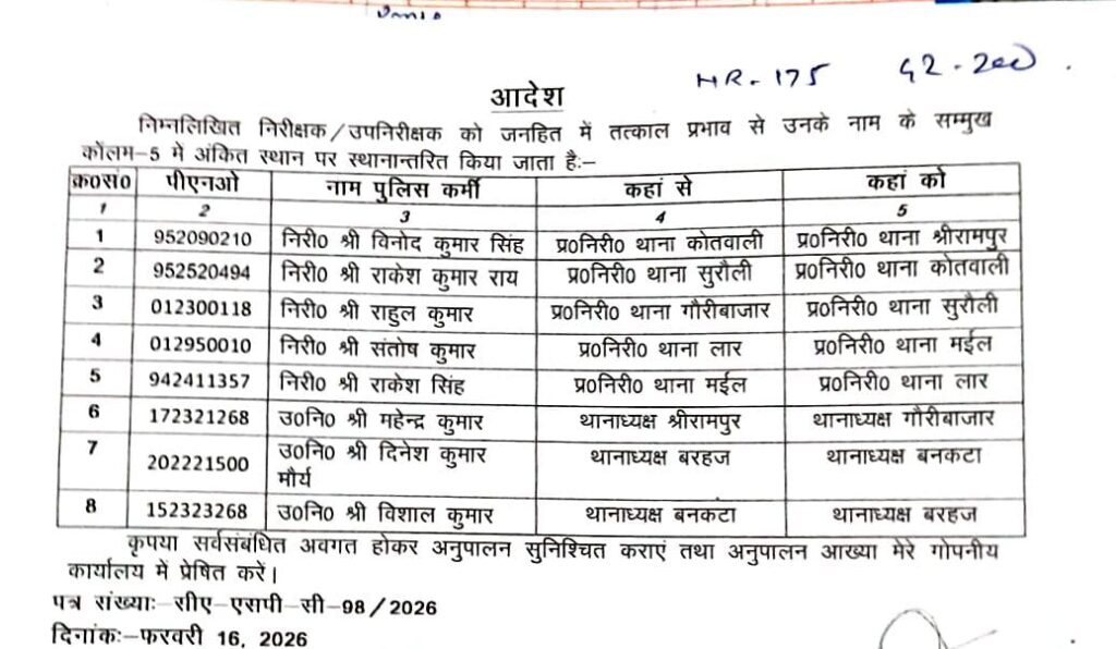 देवरिया में कानून व्यवस्था को सख्त बनाने के लिए पुलिस अधीक्षक संजीव सुमन ने 24 घंटे के भीतर आठ थानाध्यक्षों का तबादला कर दिया। इस कार्रवाई को अपराध नियंत्रण और प्रशासनिक सख्ती के बड़े संकेत के रूप में देखा जा रहा है।
