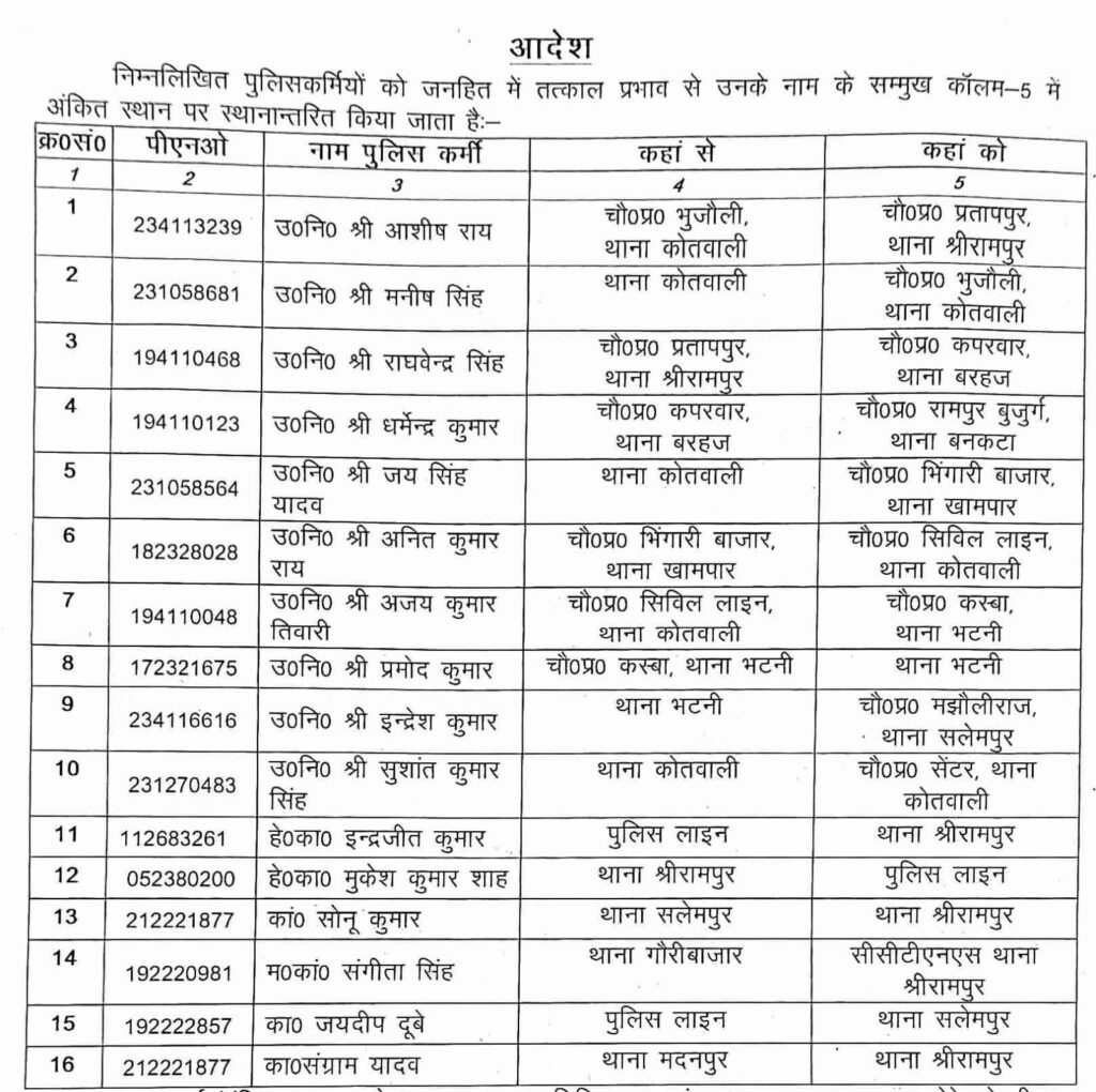 तबादला सूची के अनुसार स्थानांतरित किए गए पुलिस कर्मियों में उप निरीक्षक आशीष राय को थाना कोतवाली से थाना श्रीरामपुर के प्रतापपुर का चौकी प्रभारी बनाया गया है। उप निरीक्षक मनीष सिंह को थाना कोतवाली चौकी प्रभारी की जिम्मेदारी मिली है। उप निरीक्षक राघवेंद्र सिंह को थाना बरहज के कपरवाज का चौकी प्रभारी बनाया गया है। उप. निरीक्षक धर्मेंद्र कुमार को थाना बनकटा भेजा गया है।
